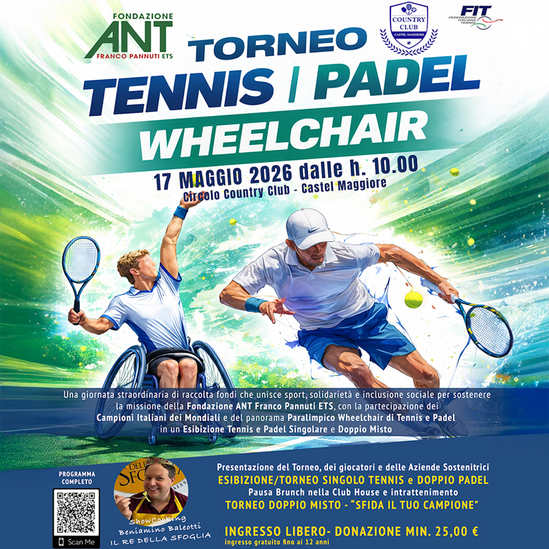Fondazione ANT, in collaborazione con il Circolo Tennis Country Club di Castel Maggiore sono lieti di invitarti, Domenica 17 MAGGIO 2026, alla I° ED. ESIBIZIONE E TORNEO TENNIS E PADEL WHEELCHAIR a sostegno delle attività di assistenza e prevenzione oncologica gratuita seguiti dalla Fondazione, un evento che unisce SPORT, INCLUSIONE e SOLIDARIETÀ. 💚